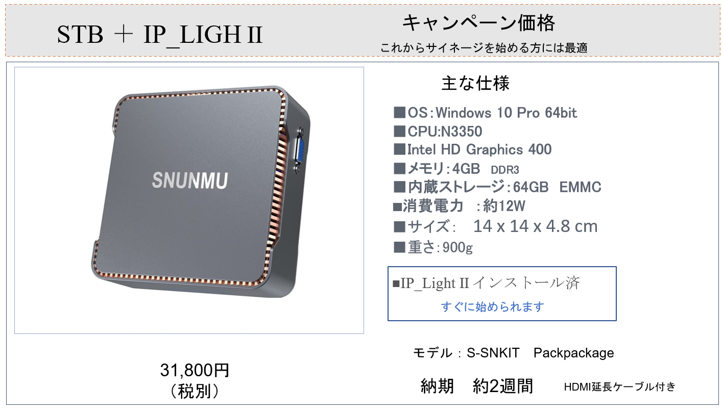 安価なSTBが多数発表されています。Windows10pro搭載のSTBもリーズナブルになりました。MB-1はOSを買うのと同じくらいの安価。(完売) IP_STUDIO Light2搭載で、購入してすぐ使えます。IP_STUDIOⅢ/Ⅳへのアップグレードも特価で提供中。 ▶耐環境性に優れた屋外利用可能なSTBです。温度特性とグラフィックを両立させた先進のSTBです。 屋外での利用を前提に耐環境性抜群、最強のスペック(温度特性:-20℃~60℃)は広告ビジネス、防災システムなどに最適です。